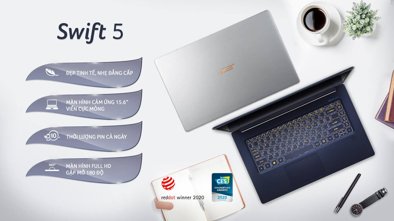 Vỏ máy được làm từ hợp kim Magie và Liti (kim loại nhẹ nhất thế giới) mang lại kích thước 15.6” nhưng trọng lượng chỉ 940g. Máy tính doanh nghiệp Swift 5 xứng đáng là laptop mỏng nhẹ nhất ở thời điểm hiện tại, cực kỳ phù hợp cho doanh nhân cần du lịch và di chuyển nhiều.