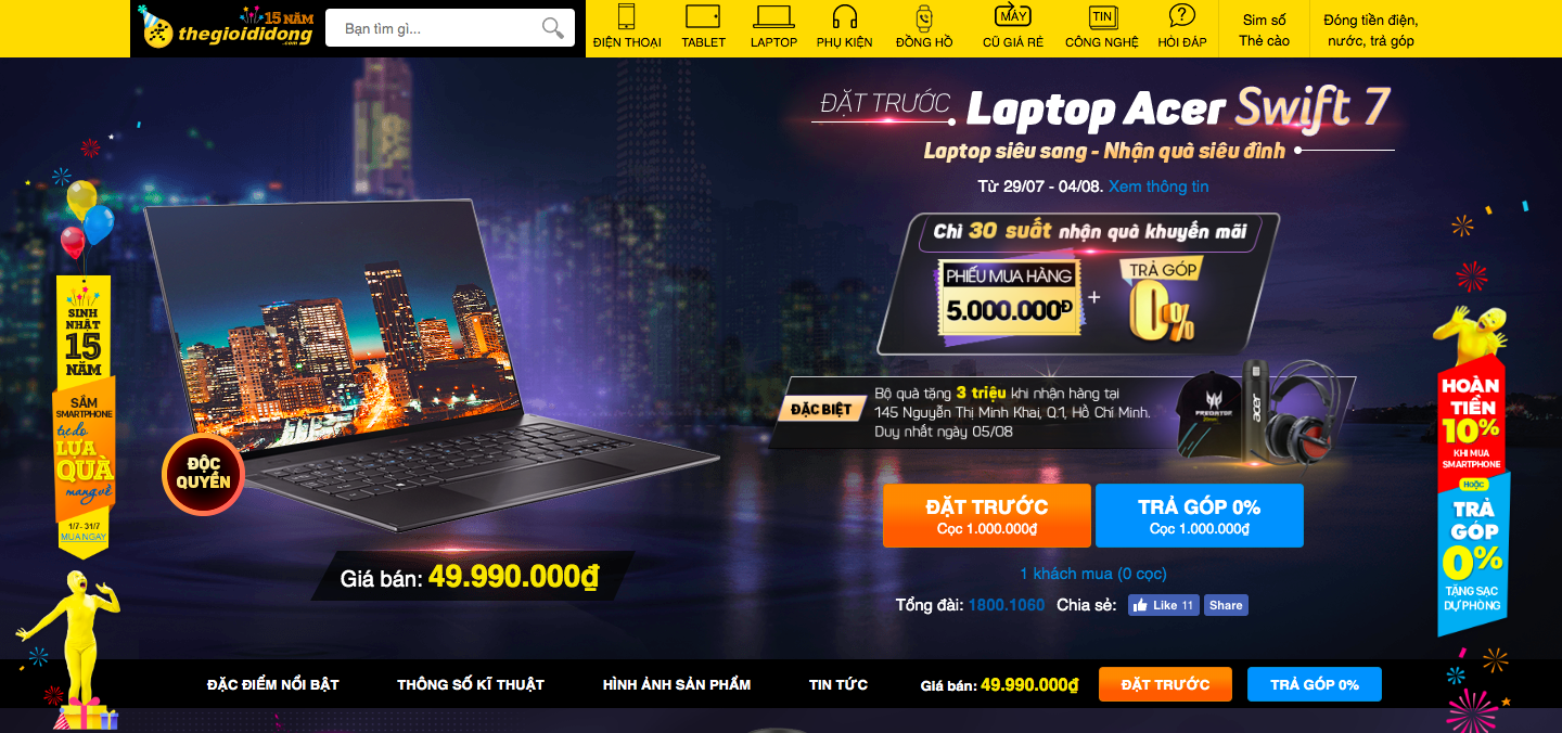 Từ ngày 29/07 – 04/08 khi đặt trước siêu phẩm Acer Swift 7 tại hệ thống Thết Giới Di Động, bạn sẽ nhận ngay phiếu mua hàng 5.000.000 đồng và cơ hội trả góp 0%!!